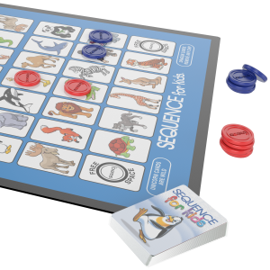 Thành phần: Sequence for Kids bao gồm một bộ bài có các hình ảnh của các con vật hoặc đối tượng thú vị, mỗi hình ảnh được lặp lại một số lần nhất định. Bản đồ trò chơi có hình ảnh của các ô trên đó, mỗi ô có một hình ảnh tương ứng với hình ảnh trên các lá bài.