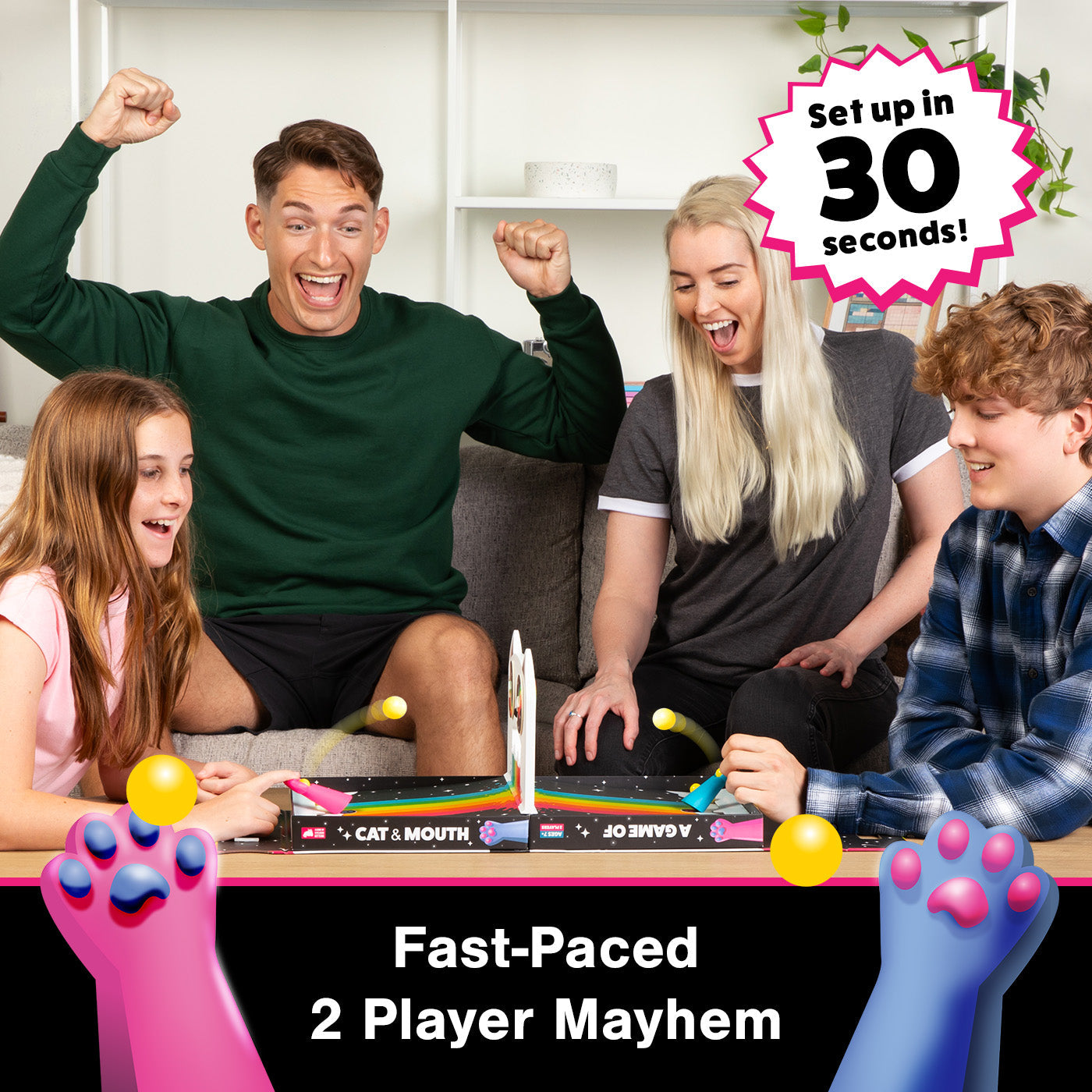 Trò chơi là cuộc đối đầu trực tiếp giữa 2 người chơi. Bạn sẽ sử dụng những chiếc chân mèo nam châm (Magnetic Kitty Paw Flickers) để bắn những viên bi qua miệng của một chú mèo khổng lồ sang sân của đối phương. Chỉ cần mở hộp ra là bạn đã có ngay bàn thi đấu – cực kỳ tiện lợi!