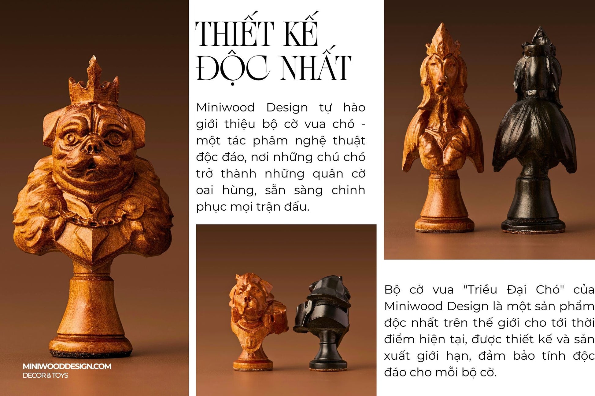 Mỗi ván cờ vua không chỉ là thử thách trí tuệ mà còn là nơi tìm thấy sự thư thái trong những phút giây tập trung tuyệt đối. Bộ cờ vua gỗ: Triều đại chó của Miniwood ra đời để phục vụ những tâm hồn đam mê cờ vua, những người không chỉ xem cờ vua như một trò chơi mà còn là một nghệ thuật sống.