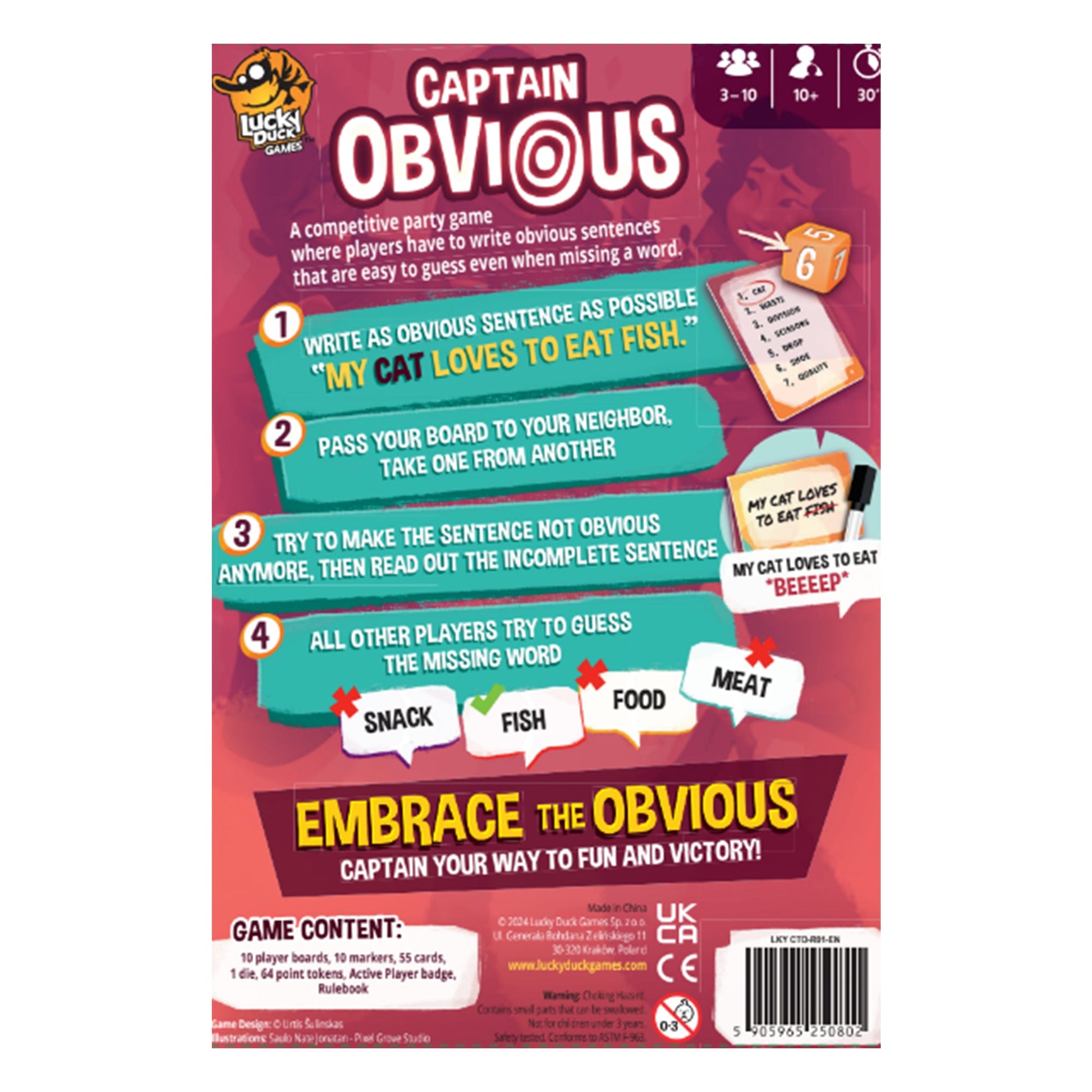 Captain Obvious là một trò chơi tiệc tùng (party game) mang tính cạnh tranh cao, nơi người chơi được tưởng thưởng vì sự hiển nhiên đến mức nực cười của mình. Trong trò chơi này, nhiệm vụ của bạn là đặt những câu văn đơn giản và rõ ràng đến mức ngay cả khi thiếu đi một từ quan trọng, những người chơi khác vẫn có thể đoán ra được. Hãy sẵn sàng để giành lấy danh hiệu 'Đội trưởng Hiển nhiên'!