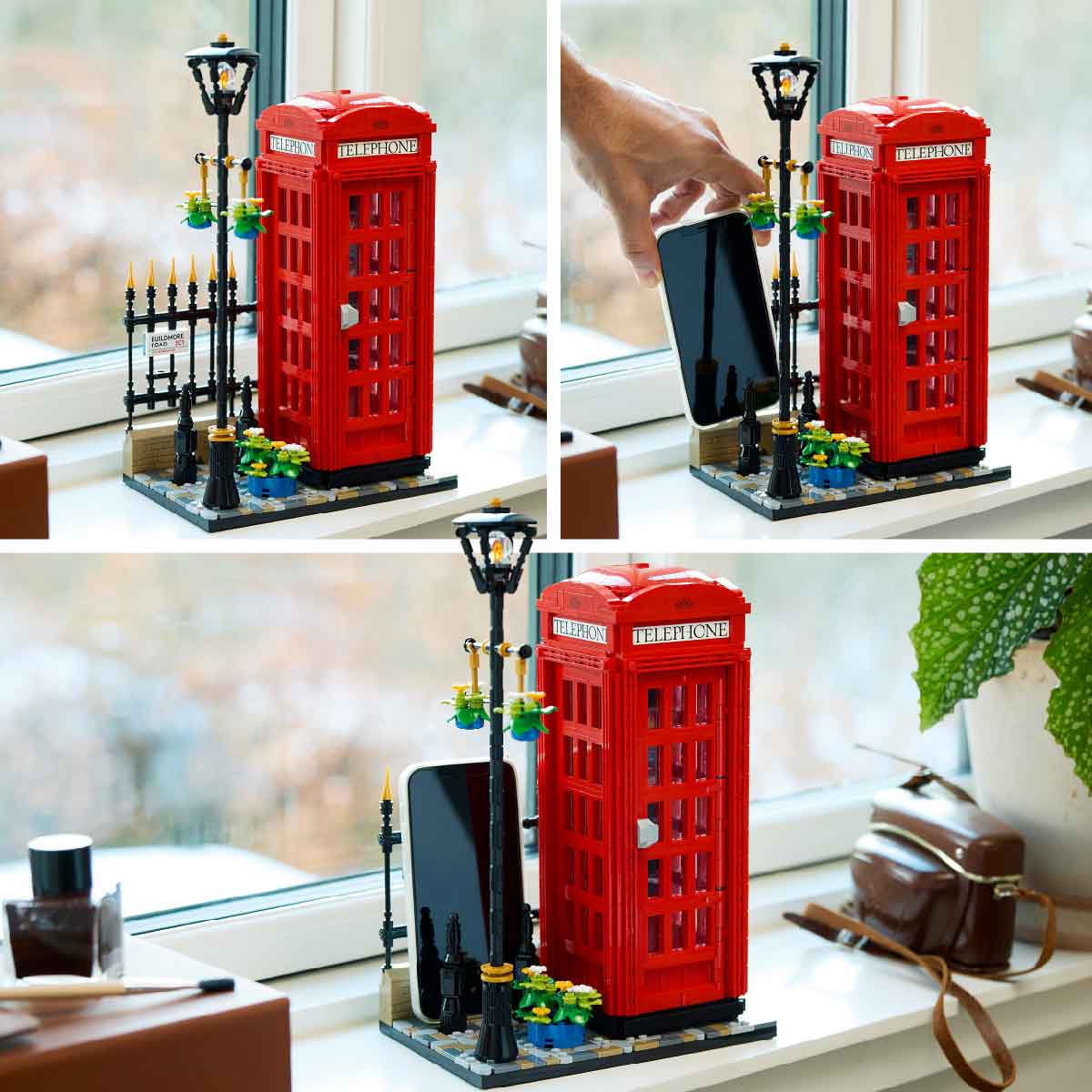 - Ánh sáng sống động: Tích hợp viên gạch phát sáng LEGO (LEGO light brick) giúp bốt điện thoại tỏa sáng ấm áp khi nhấn vào mái.