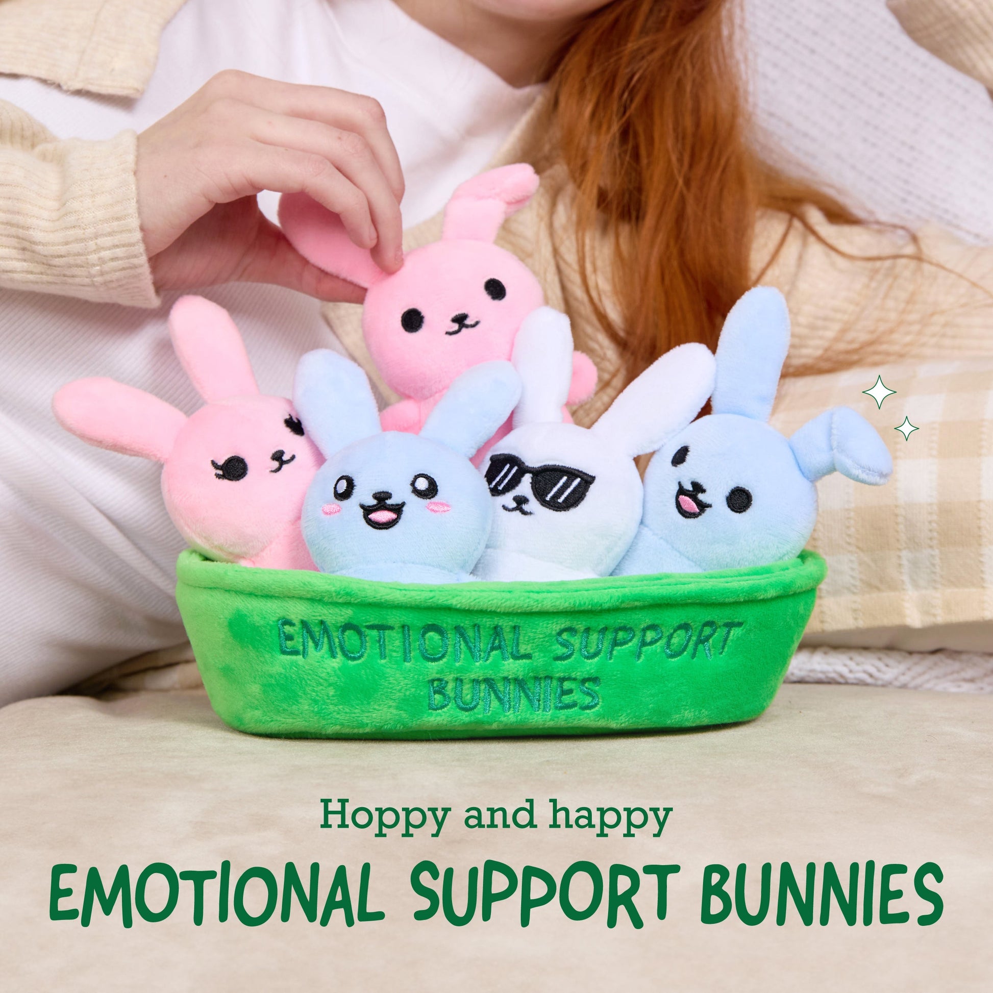 Hãy cùng đón nhận niềm hạnh phúc với Emotional Support Bunnies — một nhóm gồm năm người bạn thỏ bông siêu mềm mại, mỗi bạn đều có tên, biểu cảm riêng và độ êm ái không thể cưỡng lại. Dù bạn đang thư giãn tại nhà hay đang trong những chuyến phiêu lưu, những chú thỏ này sẽ mang đến sự hỗ trợ ngọt ngào và vỗ về cảm xúc ở bất cứ nơi nào chúng đến.