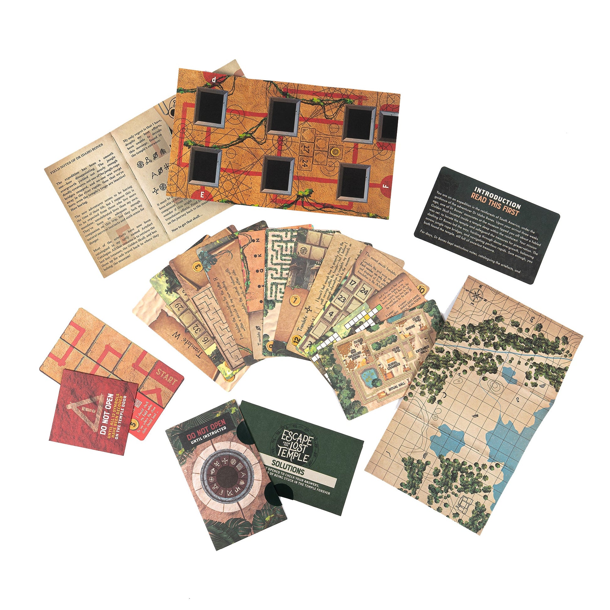 - Bộ Thành Phần Đầy Đủ: Bao gồm 12 thẻ câu đố, bản đồ chi tiết, tường đền, ghi chép thực địa, cửa thoát hiểm, phong bì bí mật và hướng dẫn chi tiết.