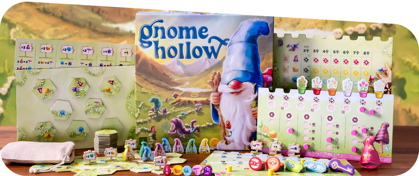 Gnome Hollow là một tựa game Eurogame tuyệt đẹp kết hợp giữa cơ chế xếp gạch (tile placement) và đặt quân (worker placement), nơi người chơi sẽ cùng nhau chăm sóc một khu vườn nấm và hoa đầy màu sắc trên bàn cờ.