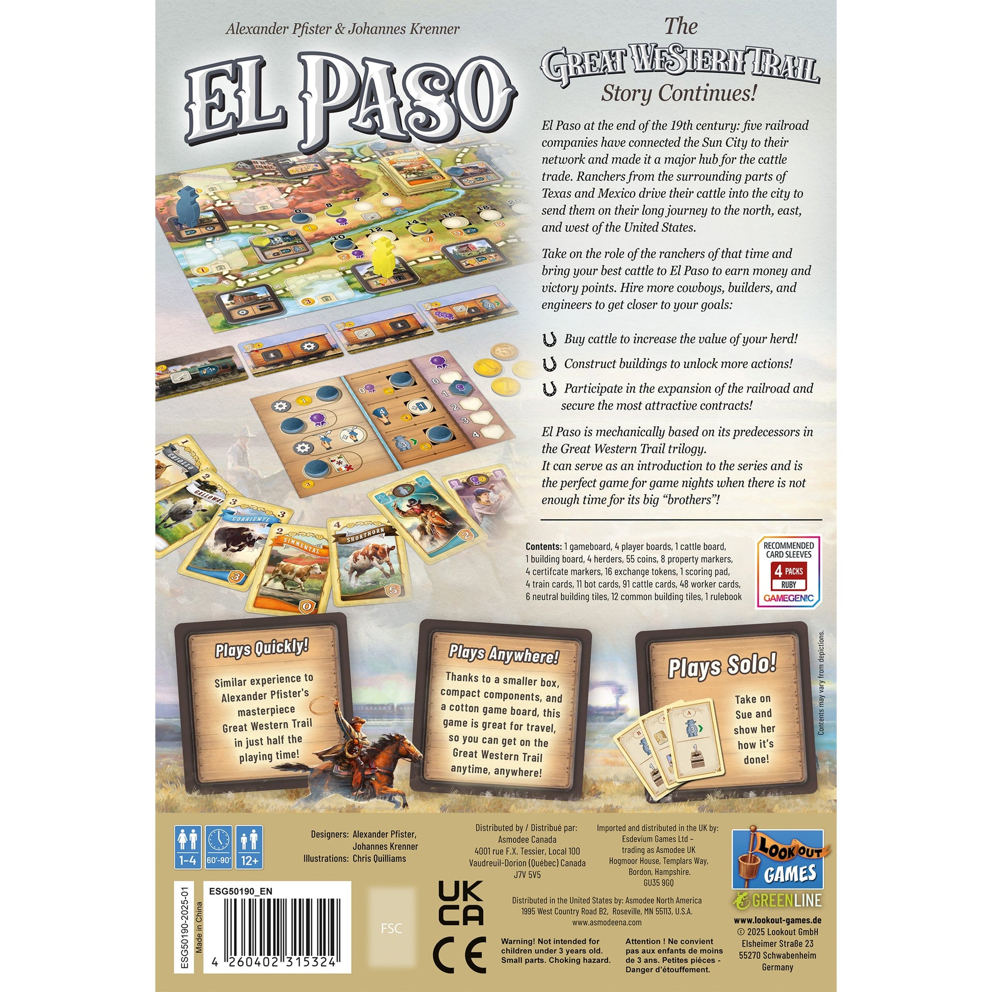 Great Western Trail: El Paso đưa bạn trở về thành phố El Paso vào cuối thế kỷ 19, thời điểm 5 công ty đường sắt lớn đã kết nối "Thành phố Mặt trời" vào mạng lưới giao thương, biến nơi đây thành trung tâm buôn bán gia súc sầm uất. Trong vai những chủ trang trại, bạn sẽ dẫn dắt đàn gia súc tốt nhất của mình đến El Paso để thu về lợi nhuận và điểm danh vọng.