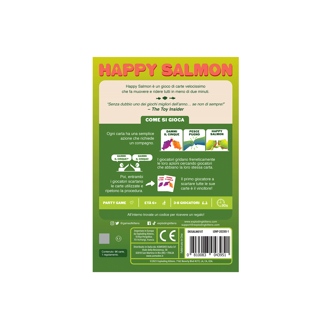 Happy Salmon là một trò chơi tiệc tùng sôi động, tốc độ cao, khiến mọi người phải vận động và cười đùa không ngớt chỉ trong vòng chưa đầy hai phút. Đây là sự lựa chọn hoàn hảo để khuấy động không khí trong các buổi gặp mặt gia đình hoặc bạn bè.