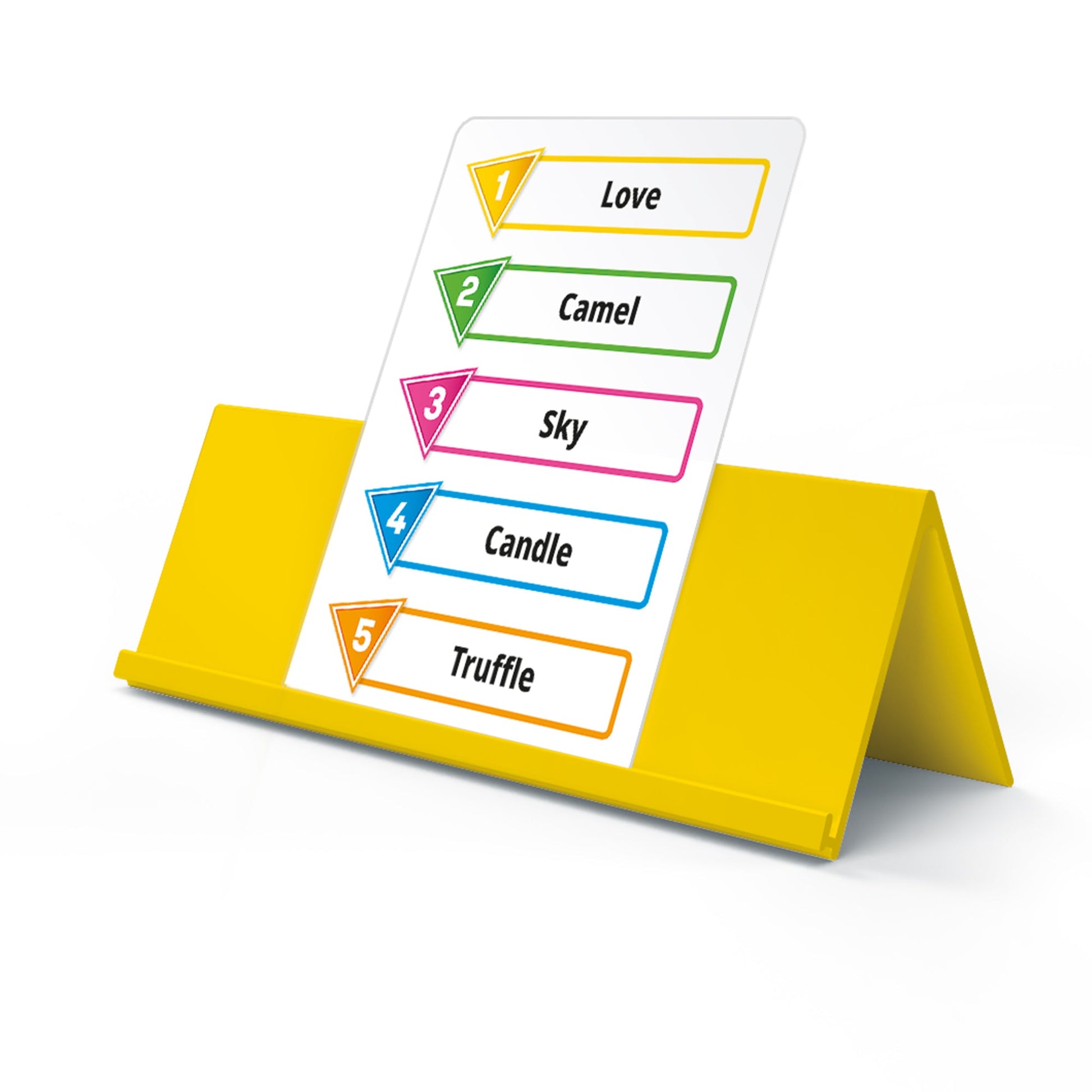 - Thành phần: 110 thẻ bài (với 550 từ khóa), 7 giá đỡ bằng nhựa, 7 bút dạ có thể xóa, 1 sách hướng dẫn