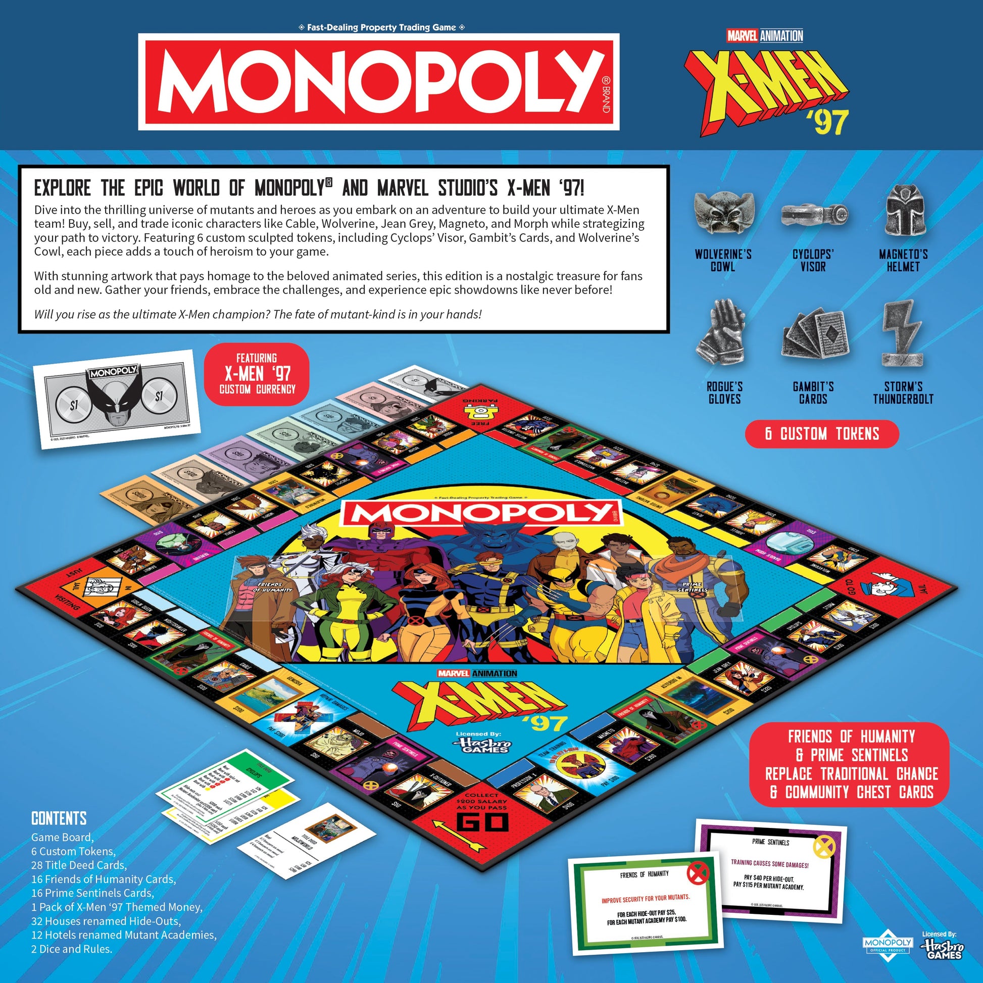 Mua, bán và giao dịch để xây dựng đội ngũ dị nhân hùng mạnh nhất của bạn. Sát cánh cùng các nhân vật huyền thoại như Cable, Wolverine, Jean Grey, Magneto và Morph để chiếm lĩnh bàn cờ. Các thẻ Cơ hội (Chance) và Khí vận (Community Chest) đã được đổi tên thành Human và Prime Sentinels, mang đến những bước ngoặt bất ngờ, từ việc đạt được sức mạnh mới cho đến việc đối đầu với những kẻ phản diện kinh điển.