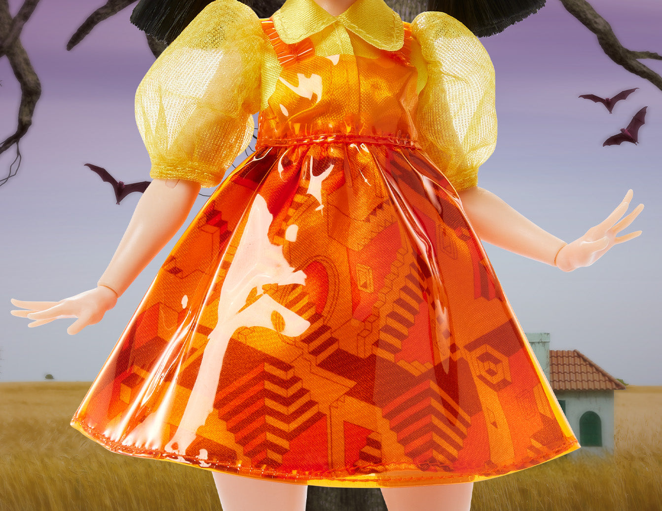 - Thiết kế chi tiết: Diện bộ váy vàng cam quen thuộc với họa tiết cầu thang bóng bẩy, đi kèm kẹp tóc Skullette đặc trưng của Monster High.