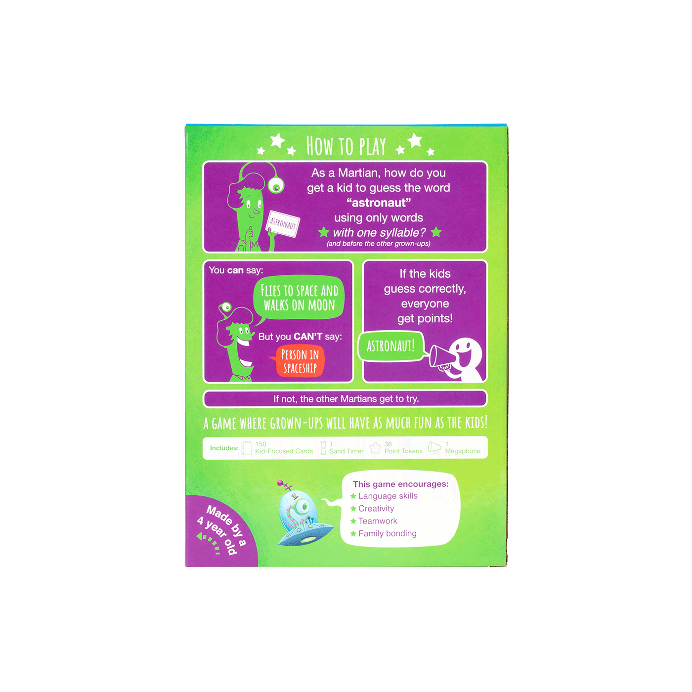 Phù hợp cho các buổi tối gia đình, tiệc sinh nhật hoặc làm quà tặng ý nghĩa cho bé từ 4 tuổi trở lên. Hãy cùng xem các bé có thể hiểu được ngôn ngữ của "người ngoài hành tinh" đang sống cùng nhà mình không nhé!