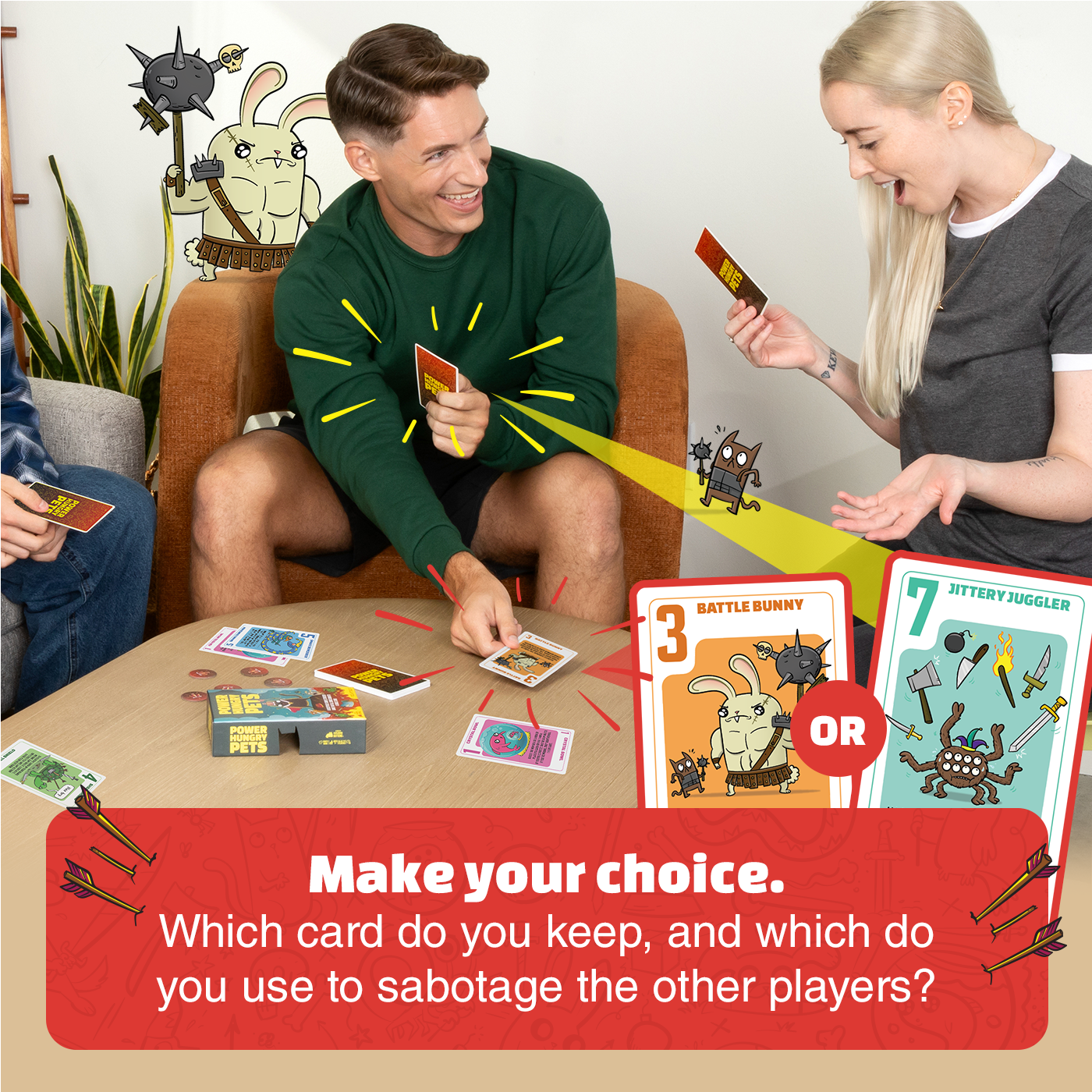 Được tạo ra bởi những nhà sản xuất của Exploding Kittens, Power Hungry Pets là một trò chơi chiến thuật dành cho những người... không thích chiến thuật cầu kỳ. Đây là một trò chơi của sự phản bội và 'đâm sau lưng' cực kỳ vui nhộn, diễn ra chỉ với một lá bài duy nhất trên tay.