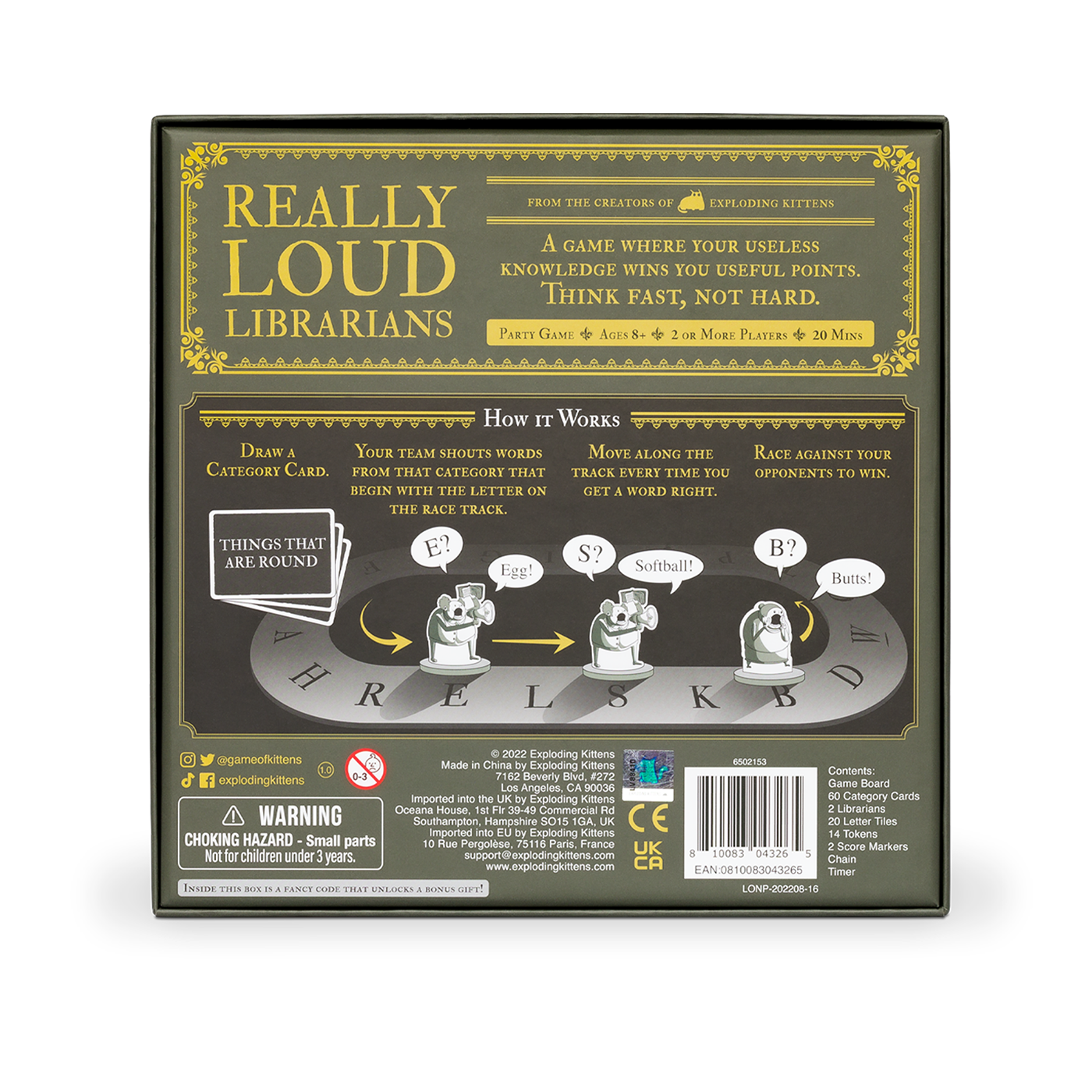 Really Loud Librarians là một trò chơi board game đấu từ vựng kịch tính, nơi những kiến thức "vô dụng" nhất của bạn sẽ giúp bạn giành chiến thắng. Đây là sản phẩm đến từ nhà sáng tạo Exploding Kittens, hứa hẹn mang lại những giây phút giải trí sôi động và đầy tiếng cười cho mọi bữa tiệc.