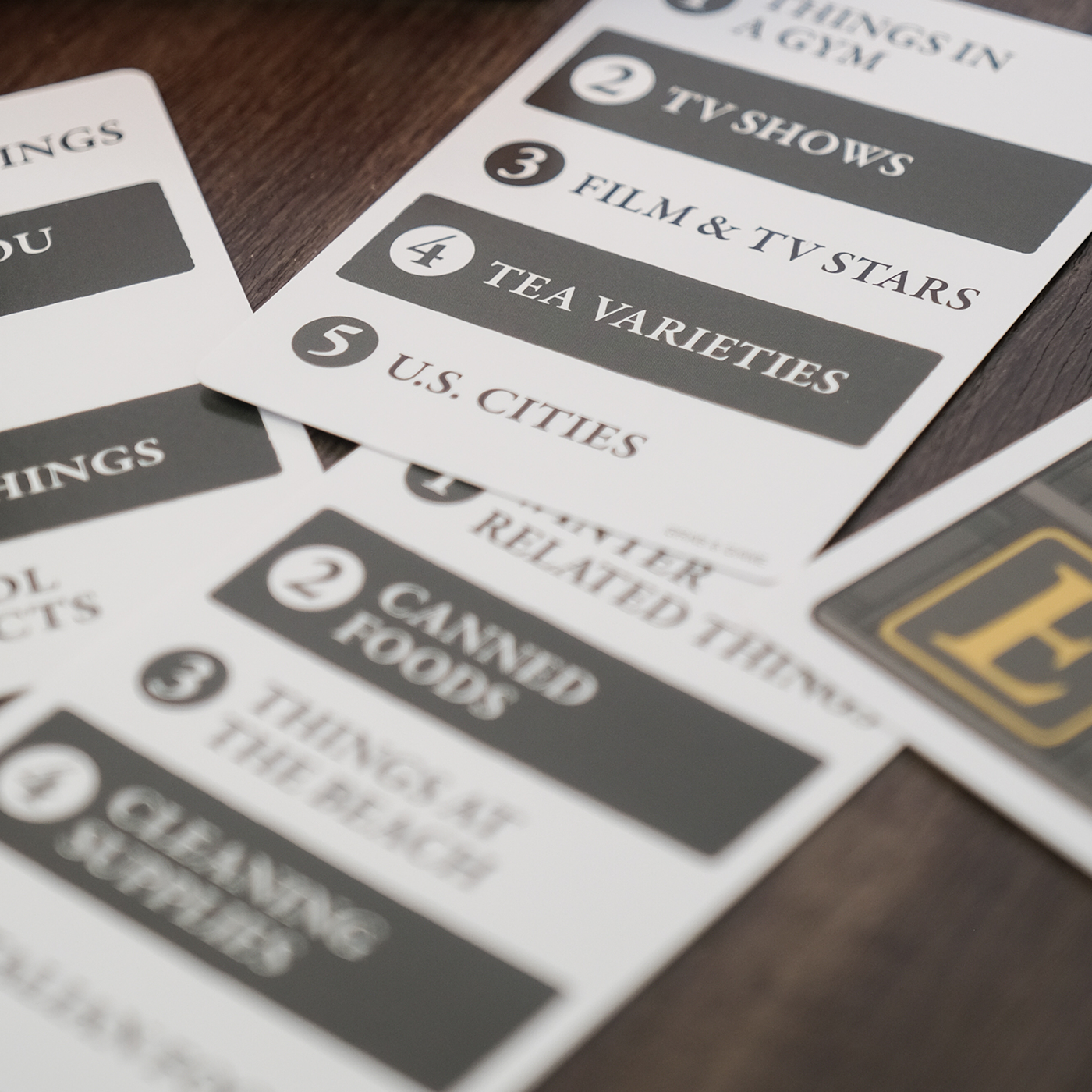 - Trong hộp bao gồm: 35 thẻ Chữ cái (Letter Cards), 20 thẻ Chủ đề (Category Cards) và một tờ hướng dẫn sử dụng.