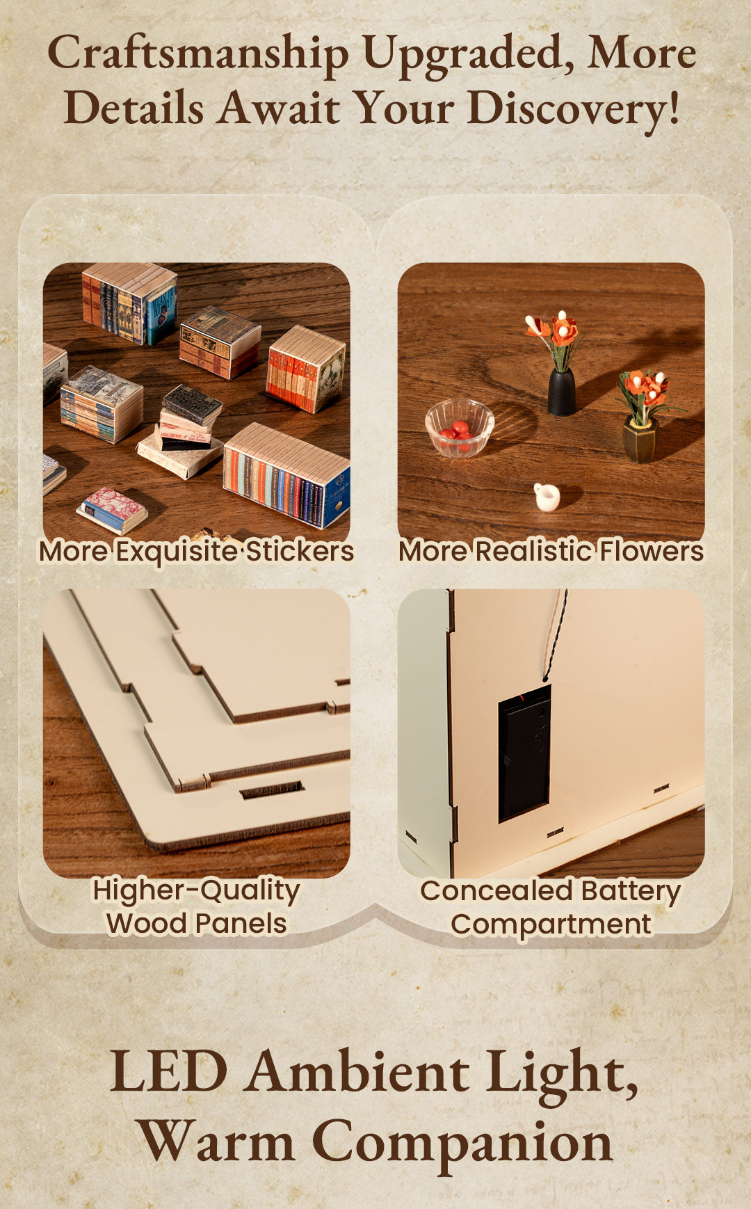 - Thiết kế tinh xảo: Mọi chi tiết từ kệ sách, bàn ghế đến những cuốn sách nhỏ đều được cắt laser chính xác, ăn khớp hoàn hảo.
