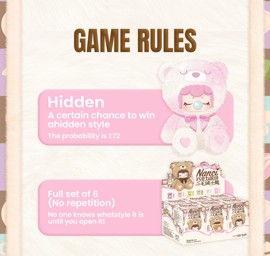 Chào mừng bạn đến với thế giới ngọt ngào của Nanci Plush Chocolate Bear! Đây là bộ sưu tập gấu bông mới nhất từ dòng Nanci nổi tiếng của Rolife, kết hợp hoàn hảo giữa sự mềm mại của thú bông và thiết kế độc đáo của dòng Art Toy. Mỗi chú gấu mang một tông màu socola và kẹo ngọt khác nhau, mang lại cảm giác ấm áp và vui vẻ.