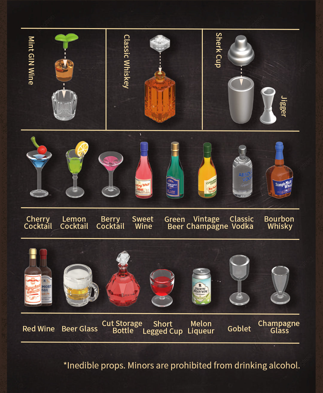 - Thiết kế tinh xảo: Tái hiện sống động không gian một quầy bar hiện đại với đầy đủ các phụ kiện như ly, chai rượu, bảng hiệu và nội thất phong cách.