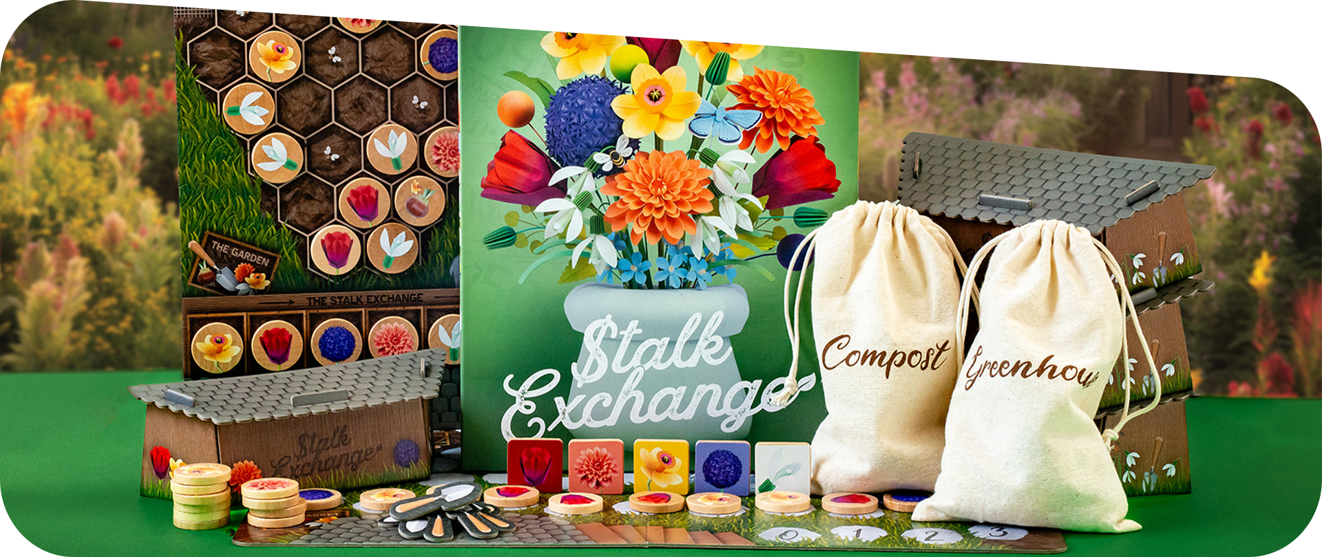 - Thành phần cao cấp: Các token hoa hai mặt, túi Greenhouse và Compost chuyên dụng, cùng bảng chơi thiết kế đẹp mắt.