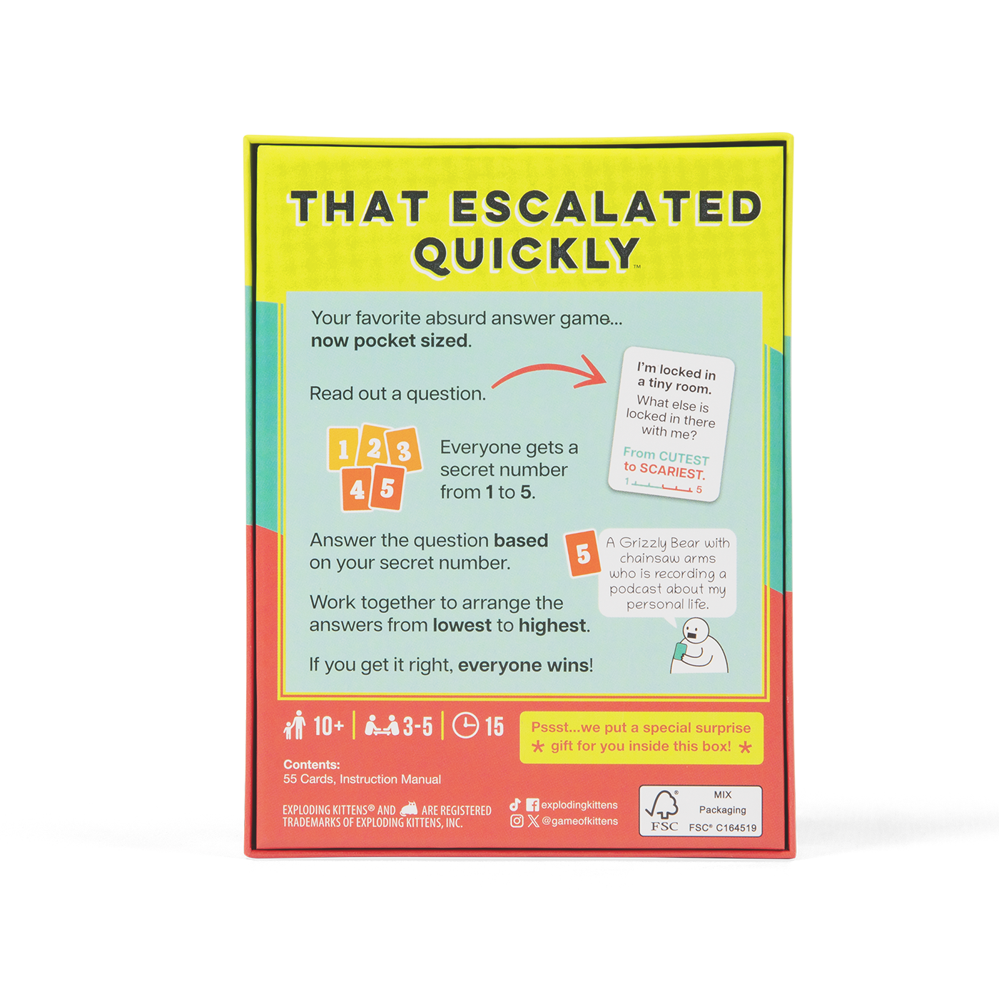 Trong That Escalated Quickly: Grab and Game Edition, bạn và bạn bè sẽ cùng nhau làm việc để sắp xếp những điều vô lý theo đúng thứ tự. Bạn sẽ bắt đầu những cuộc tranh luận, cười nghiêng ngả và khám phá ra những góc khuất kỳ quặc nhất trong suy nghĩ của mọi người xung quanh.
