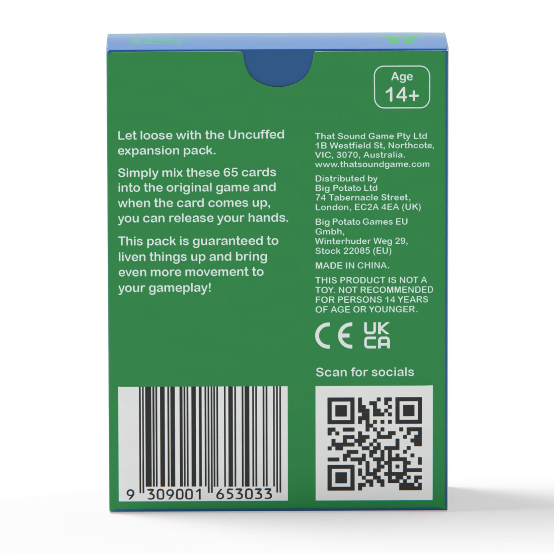 Khơi dậy mọi giác quan và sự cuồng nhiệt với That Sound Game - Uncuffed Pack Expansion. Đây là bản mở rộng tuyệt vời được thiết kế để mang lại sự tự do và những chuyển động không giới hạn cho các bữa tiệc của bạn. Chỉ cần trộn 65 lá bài mới này vào bộ cơ bản, và chuẩn bị sẵn sàng cho những tình huống dở khóc dở cười khi bạn được giải phóng đôi tay để diễn tả âm thanh một cách sống động nhất.