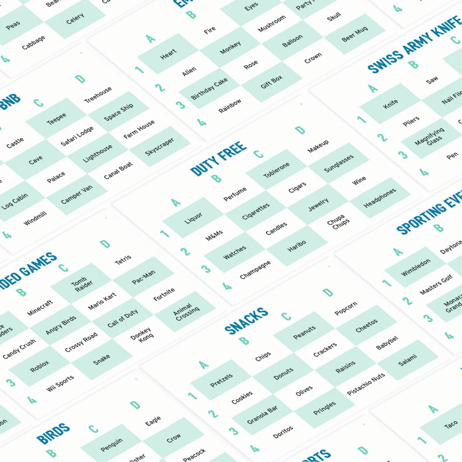 - Thành phần bộ trò chơi: 40 Thẻ chủ đề (Topic Cards), 16 Thẻ mã số (Code Cards), 2 Xúc xắc.