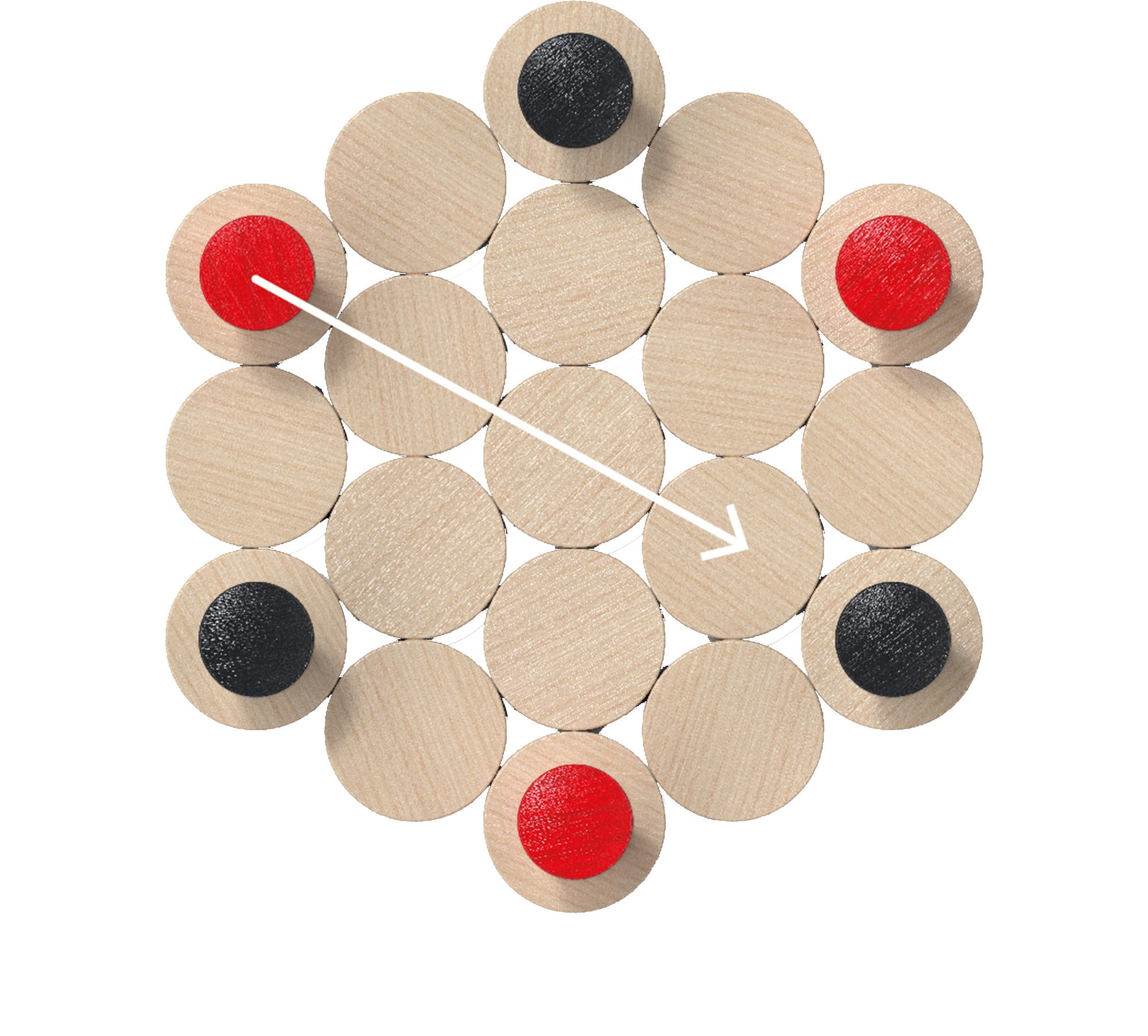 - Thành phần: 19 đĩa gỗ, 6 quân cờ gỗ (3 đỏ, 3 đen), 1 sách hướng dẫn luật chơi