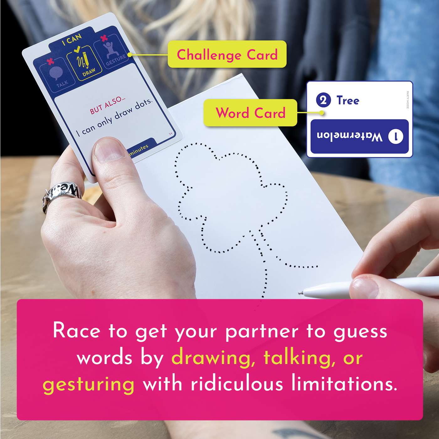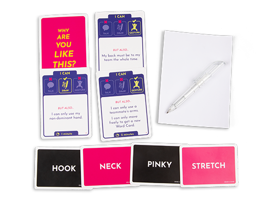 Mục tiêu là giúp đối phương đoán được càng nhiều từ khóa càng tốt trước khi hết giờ. Bạn có thể chọn cách nói, vẽ hoặc dùng hành động. Tuy nhiên, mỗi thẻ bài đều đi kèm với một thử thách oái oăm khiến việc truyền đạt trở nên khó khăn và hài hước hơn bao giờ hết.